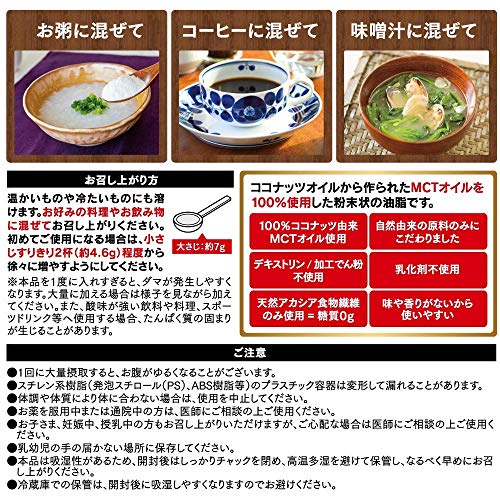 MCTオイルを100%配合した、栄養価の高いパウダーです。温かいものはもちろんのこと、冷たいものにも溶けるので、あらゆる食品に役立てられます。アイスコーヒーやアイスティーなどに溶かして飲めば、手軽にエネルギー補給できるのがおすすめポイントです。