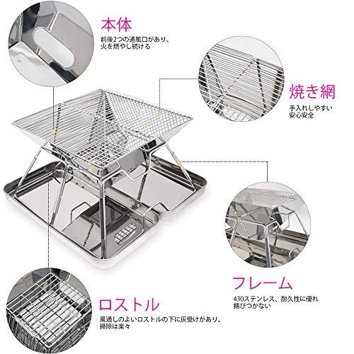 たっぷりと木材を入れられるため、安定的な高火力で焚き火を楽しめるでしょう。直径0.2cmのステンレス鋼を材料に使用した焼き網は半分に折りたたむことができ、コンパクトに収納可能です。