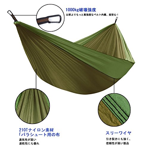 のんびりと過ごしたい方は、ハンモックを持って行きませんか?本を読んだり、音楽を聴いたりといった楽しみ方を満喫したい場合に役立ちます。こちらは、高品質のパラシュートナイロンを使用し、耐荷重は350kg。大人が2人乗っても十分なサイズです。