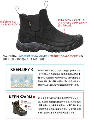| 素材 | ゴム/デュアル・クライメートラバー、アウトソール・ライニング(靴内側の裏張り)/KEEN.Dry防水透湿メンブレン、アッパー(靴の甲部分)/ウォータープルーフレザー |