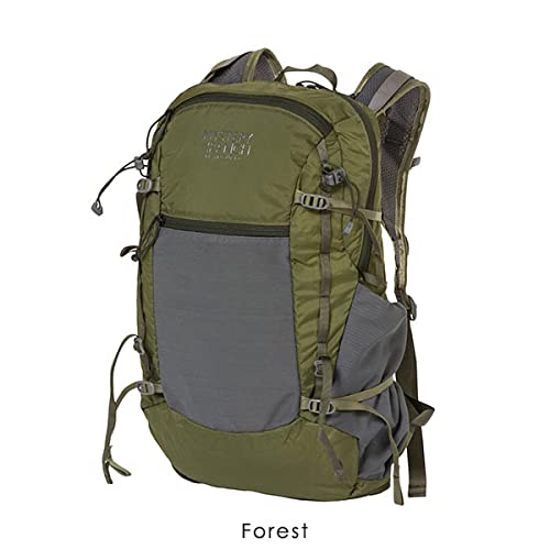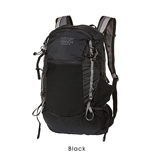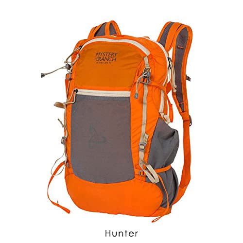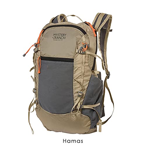 ザックのフロントには、ソロキャンプで使用する細かな道具の出し入れに便利なジップポケットが2か所装備されました。サイドにもメッシュ仕様のポケットが設けられていて、小物類をすっきりとまとめられる豊富な収納スペースが備わっているザックです。正面にはミステリーランチのブランド名が付いています。