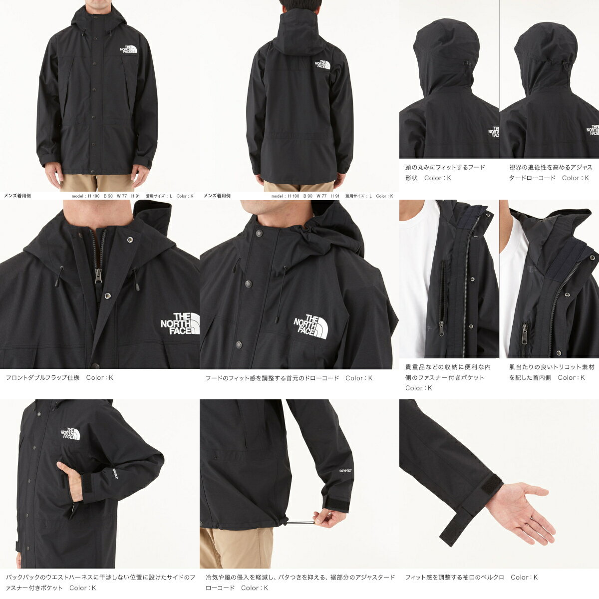 | 素材 | 素材構成: 表地 70D GORE-TEX 2L 表: 100% ナイロン; 裏: 合成繊維(ePTFE); Embossed Taffeta 裏地: 100% ポリエステル |