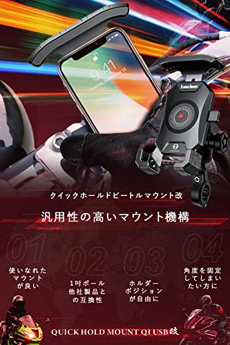 Qi-OFF-USBの切り替えスイッチ付属で、キー連動の仕方が分からない方も簡単に接続でき、IP66の防塵防水で突然の雨にも取り外す必要なし。ロードバイカーのスマホホルダーとしてもおすすめできます。
