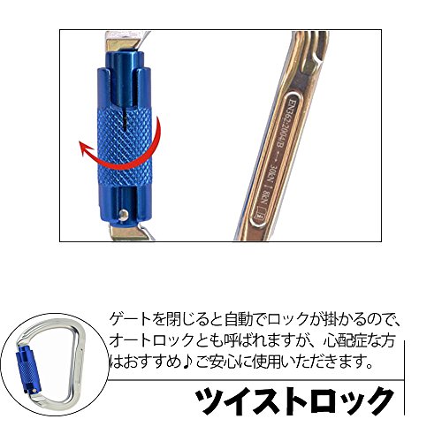tsubasaメーカーのスクリュータイプのカラビナは、D型です。サイズは先ほどのカラビナより少し小さいですが、ゲートオープンは同じサイズとなっています。ブラックとオレンジカラーがおしゃれな商品で、強度も30KNと上部に使っていただける商品です。また、こちらもCE認証がありますので、安心して使っていただけます。