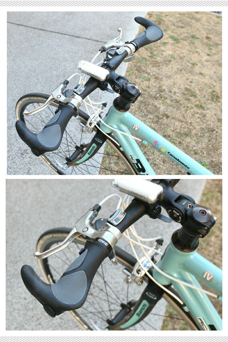エンドバーの役割を果たす牛角型持ち手が付いた自転車用ハンドルグリップで、平たい形状で手が触れる面積が広いため、長時間のサイクリングでも手が疲れにくいと実感できるでしょう。手汗をかいている時にも滑りにくい、高グリップ滑り止め加工も施されました。