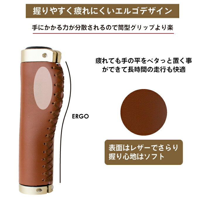 自転車におすすめなこちらのハンドルグリップは、本革を素材に採用していて、使用するごとに手にも馴染みやすくなっていく商品です。エンドパーツには軽量で丈夫なアルミ素材を使用しています。