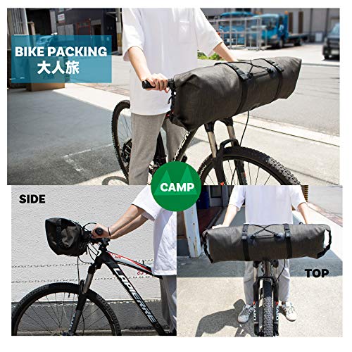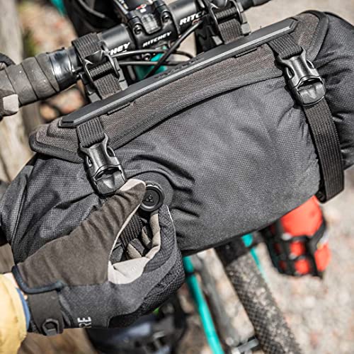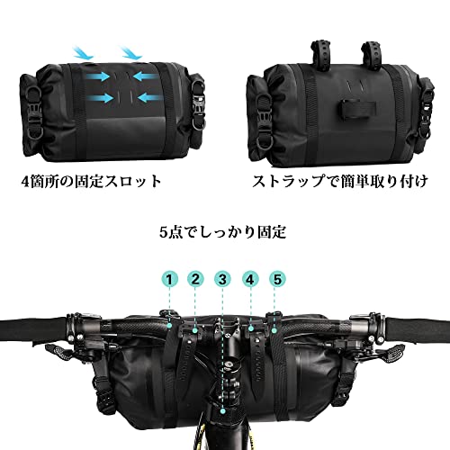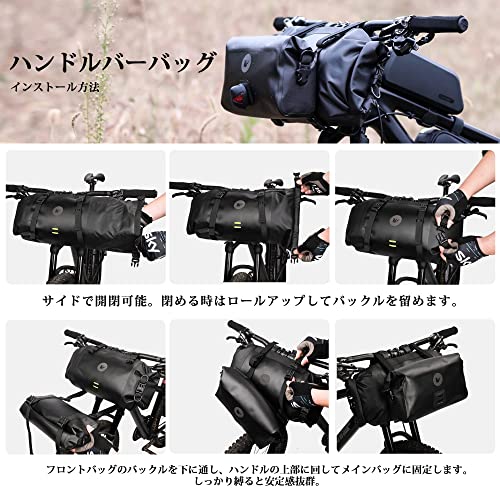 収納バッグは2つに分かれていて、1つは8Lでもう1つは4Lの合計12L容量のフロントバッグです。合計5点でしっかりとワンタッチ固定できます。サイドから開閉することもでき、閉める時にはロールアップしてベルクロを留められる設計です。取り付け時には工具などを用意する必要はありません。