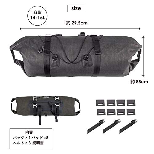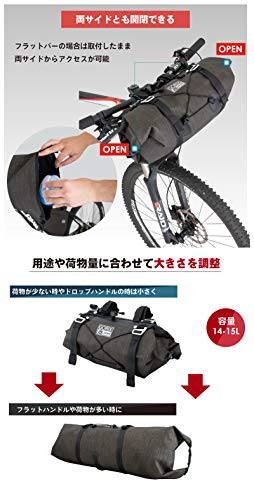 紐付きのエア抜きバルブ機能を追加して、バッグ自体をコンパクトに圧縮できるようにしました。大容量の15Lサイズで、クロスバイクやマウンテンバイクのフラットハンドルに取り付けるのがおすすめです。