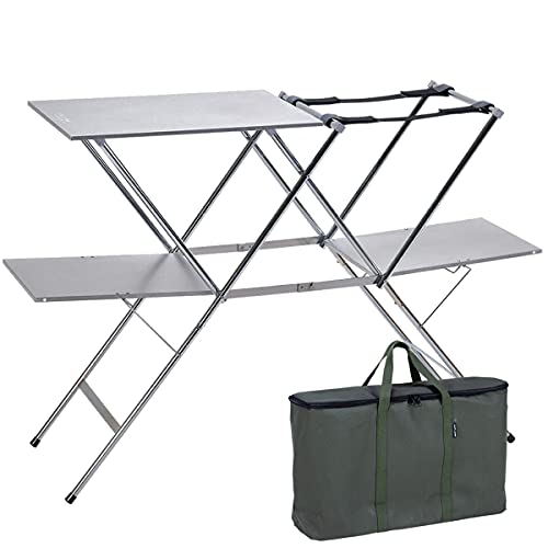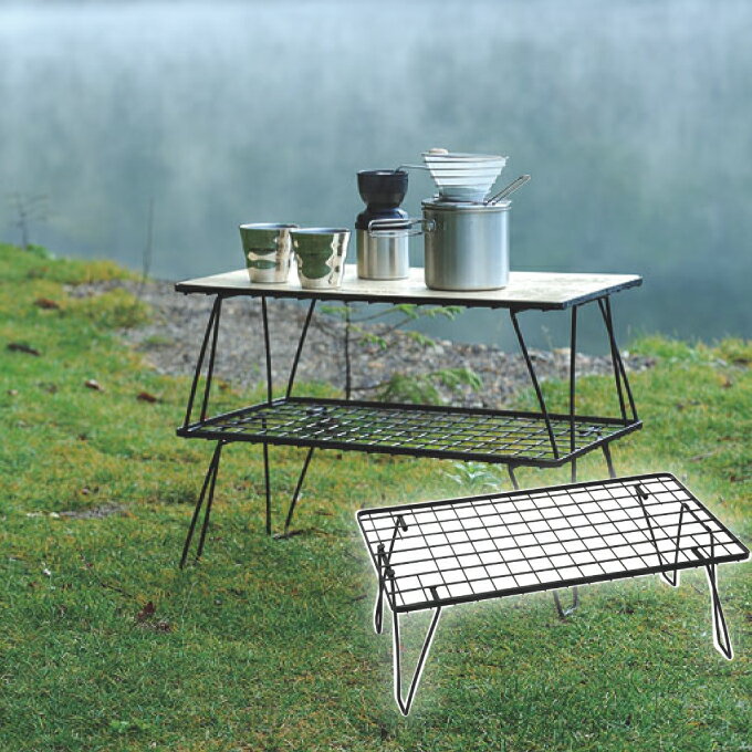 高さ調整をかねて2段重ねにすれば、ラックに天板をのせて、食材や調味料、スキレットや重量のある鍋、ダッチオーブンなどをのせてもOK。ツインバーナーをのせた調理も可能なおすすめ人気ラックです。