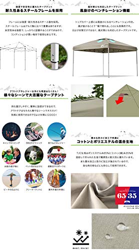 本品の生地は、コットンとポリコットンの混紡で遮光性が高く火の粉で穴が空きにくい特別なモデルです。設営方法は他のワンタッチタープと変わりませんが、火に強いためバーベキューがしやすくなっています。また、遮光性が高いためバザーなどのイベントにもおすすめできます。