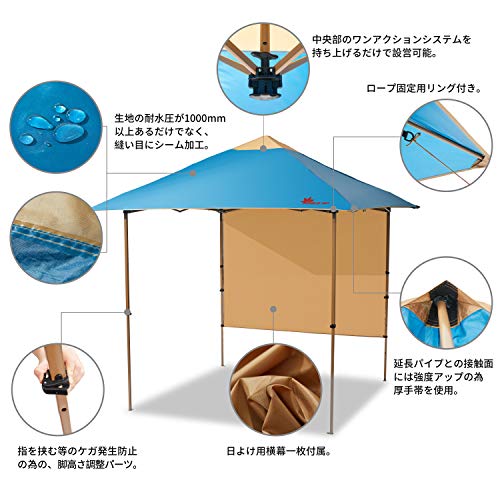 人気ブランドの使い勝手がいいワンタッチタープです。キャンプ初心者やアウトドアに馴染みがない方でもすぐに組み立てられるようになっています。別売りのオプションには非常に珍しいバグネット(蚊除け)もありピクニックやデイキャンプが手軽に楽しめるおすすめタープです。