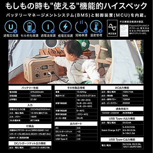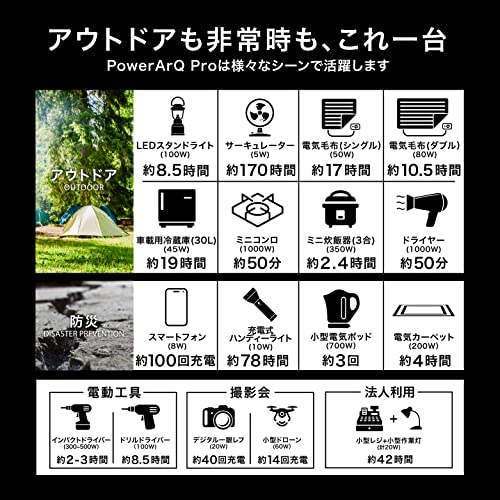 SmartTapのキャンプ用ポータブル電源PowerArQProは約28万mAhという大容量バッテリーで、かつ最大出力のワット数は1000Wとキャンプや車中泊においては十分すぎるほどの性能を誇ります。