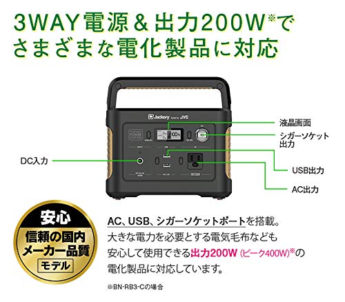 JVCケンウッドのキャンプ用ポータブル電源は重量が3.6kg、サイズが13cm×23cm×17cmと女性でも楽々持ち運べるほどコンパクトです。バッテリー容量は86400mAh、出力ワット数は200と少人数のアウトドアには十分すぎるほどの性能を持っており、口コミでも高評価を得ています。