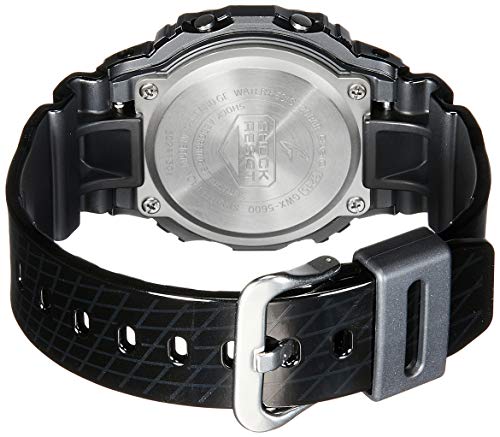 コンパクトな5600型のブラックボディに光沢塗装を施していて、上質感のあるミラー加工メタルパーツを採用しています。バンドにはインパクトのあるグリッド状のデザインをプリントした登山時計です。耐衝撃構造のショックレジスタンスで、万が一硬い地面に落としても壊れてしまう心配がありません。