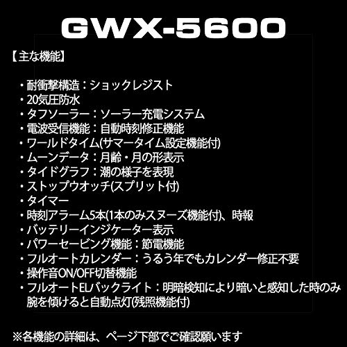 カシオのg-shock・ジーライド(GWX-5600-1JF)は、世界6局の標準電波を受信する、シリーズ初の電波ソーラー化が実現されたモデルです。水深200M相当の圧力に耐えられる20気圧防水なので、天候が悪い日のアウトドアシーンや海水浴中も安心して身に付けられるでしょう。