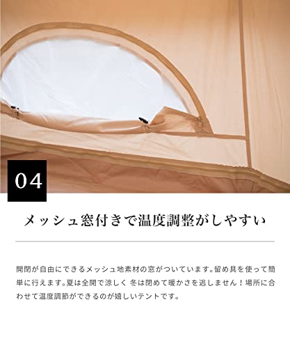 また、開閉が自由にできるメッシュ素材の窓がついていますので、夏は全開で涼しく、冬は閉めて暖かさを逃さないようにできます。設営・収納も簡単ですので初心者の方にもおすすめです。