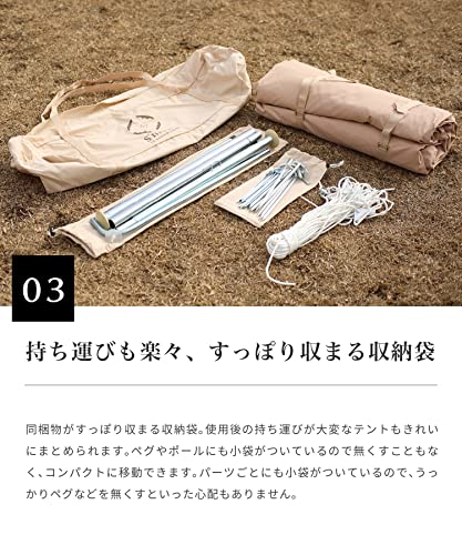 こちらはソロ~3人まで使用できる小さなテントです。他テント同様にポリコットン素材を使用しており、耐水圧や撥水性も同様です。1人での使用にも適していますので、ソロキャンプで使えるものを探している方にもおすすめできます。