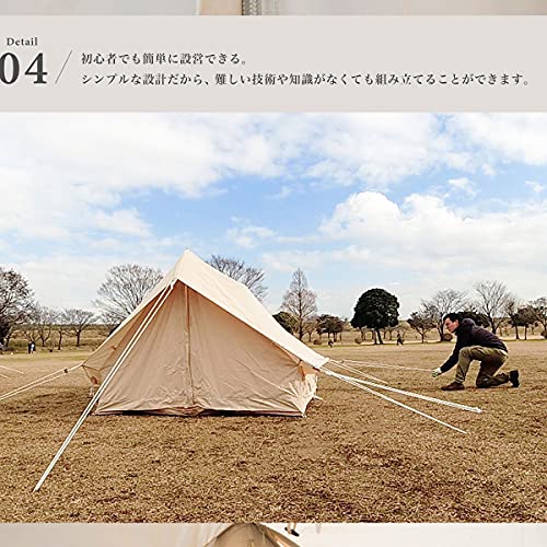 価格は約6万円ほどとなっており、他ブランドのベル型テントよりもコストパフォーマンスが高いのがポイントです。シンプルなセンターポールのデザインですので、設営も簡単なワンポールテントとなっています。