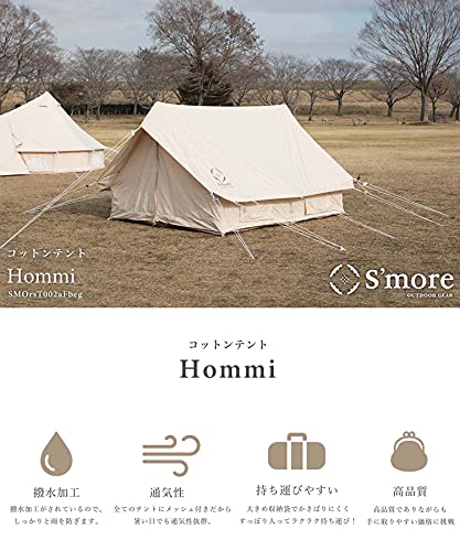 Hommiは家の形をした、小屋型のテントです。こちらは4人まで使えるサイズになっていますので、ソロよりはファミリーでの使用に向いています。生地は他と同様に高品質ポリコットン生地を使用していますので、耐水圧は約350~500㎜を想定しておきましょう。