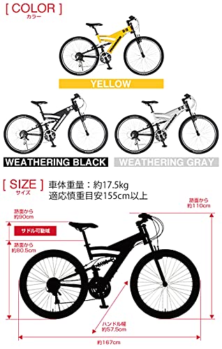 自転車初心者におすすめなフルサス搭載のMTBが、「SPEAR マウンテンバイク アルミフレーム」です。街乗りに適した自転車ですが、スポーティーさを感じさせるデザインにも人気が集まっています。カラー展開も豊富なので、好みに合わせて選んでみましょう。