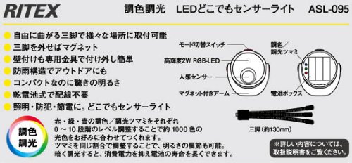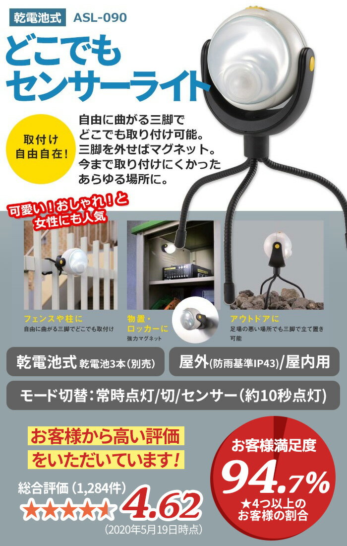 人感センサーライトは、人や動物が近づくと自動反応してライトが点灯する定番の防犯グッズです。画像の「ムサシ・どこでもセンサーライト 」は反応範囲が4メートルですので、不自然なほど近寄ってくる人がいた場合に点灯し、犯人を驚かせます。
