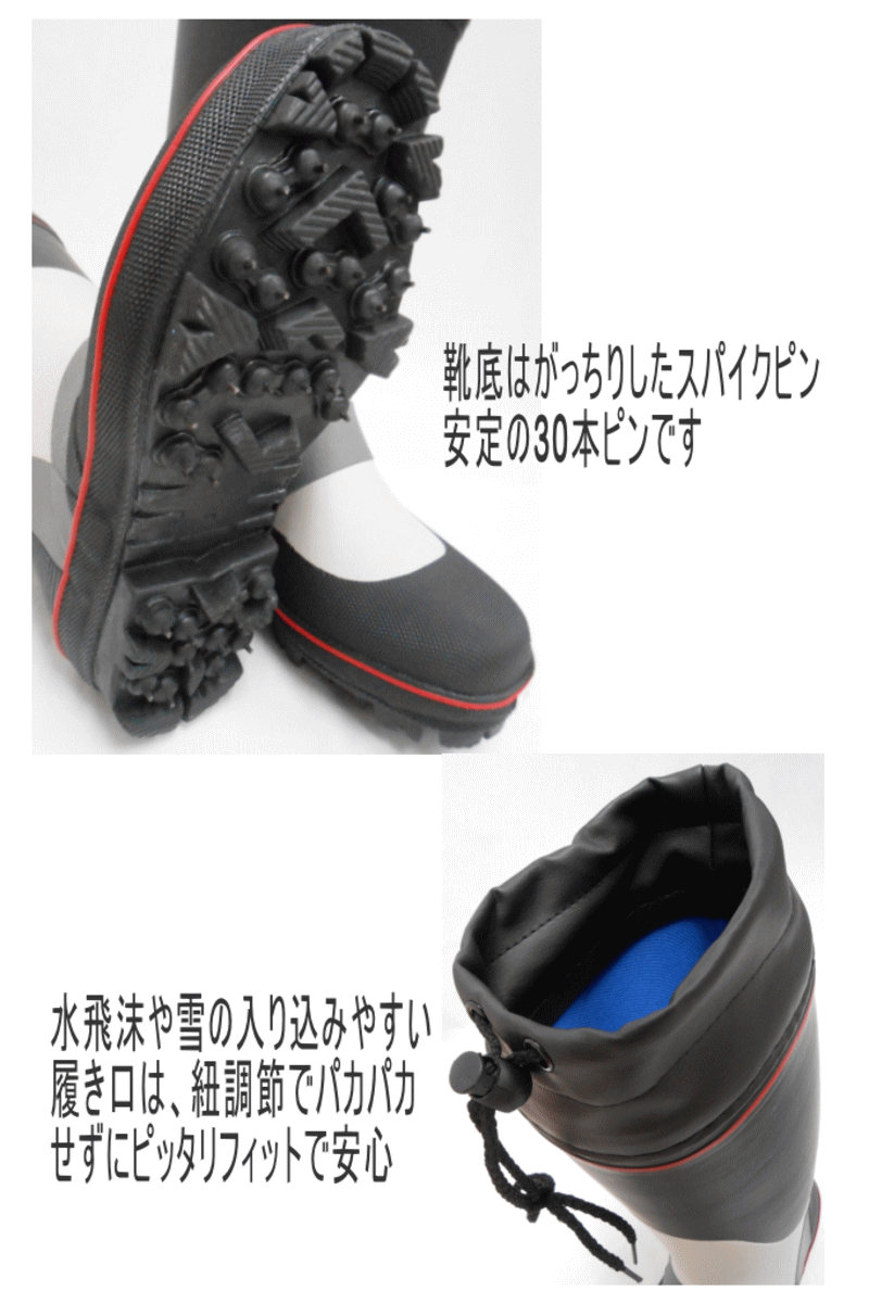 ブーツタイプの釣り用スパイクシューズは、水しぶきのかかる場所や寒さの厳しいロケーションでの釣りにおすすめです。足をしっかり覆って、中に水が侵入しないような構造になっています。そのため水溜りや水深のある場所にも入れるのがメリットです。