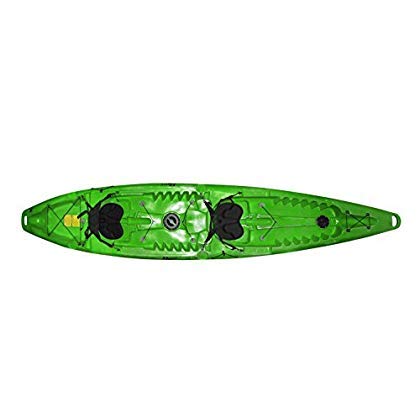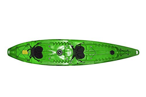 こちらの2人乗りカヤックはフィッシング用の専用ロッドホルダーを備え、タックルを収納するバンジーコードが後部に取り付けられています。