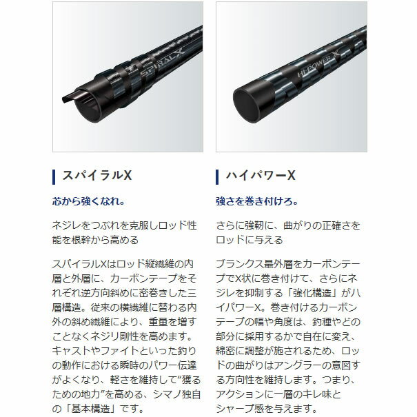 ブランクスはグリップの近くまで曲がる仕様で、手元で当たりを感じやすく繊細なアクションができます。ブランクスはスリムな設計ですが、カーボンテープをらせん状に巻き付ける「スパイラルXコア」の採用により耐久性も抜群です。