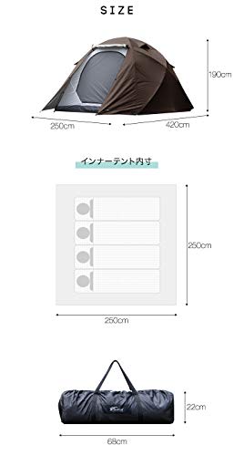 | サイズ | 本体サイズ : (約)250cm×420cm×190cm インナーサイズ : (約)250cm×250cm×185cm 収納時 : (約)68cm×22cm×22cm |