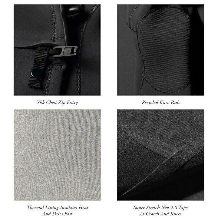 ウェットスーツの袖口の裏面には「Liquid Taped Cuff Seals」が施されており、水が侵入するのを防げます。ニーパッドには「Supratex Abrasion Resistant Jersey」という特殊な素材が使われていて、強度と伸縮性に優れています。