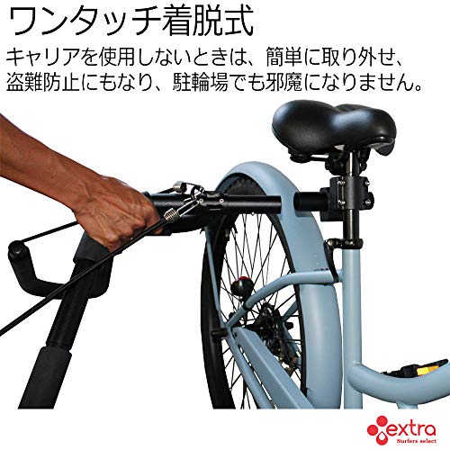 サーフィン関連のグッズを扱うエクストラ(EXTRA)の自転車用サーフボードキャリアです。5kgまでのショートボード1本を積載することができて、直径25mmから31.8mmまでのシートポストに取り付けることができます。
