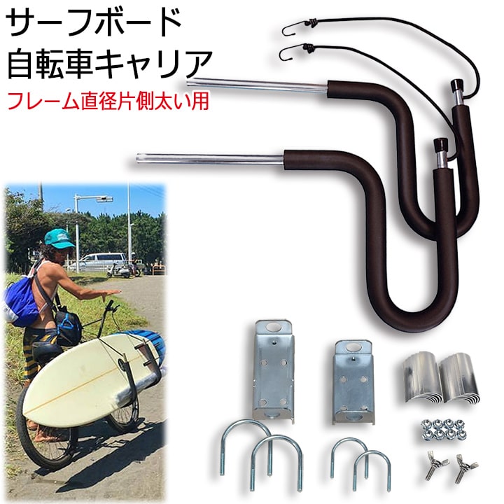 神奈川県に本社のあるキャップ(CAP)のサーフボードキャリアで、ショートからロングボードまで汎用的に使うことができます。トップチューブとサドルポストに指示金具を取り付けナットで2つのバーを固定する仕組みで、蝶ネジタイプのため取り外しも簡単にできます。