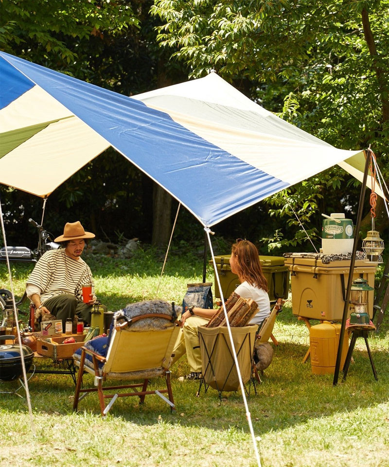 ベージュのテントと合わせるならば、さわやかな青が入ったストライプのタープはいかがでしょうか。アウトドアに映えるアースカラーは同系色のベージュや茶色・グリーンと合わせるのが定番ですが、空の青さを切り取ったようなさわやかなブルーもよく似合います。