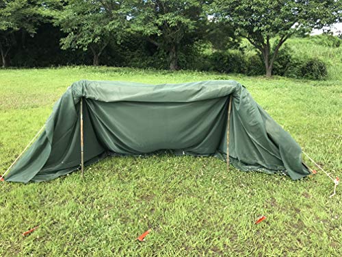 基本の設営方法は極めてシンプル。つなぎ合わせた幕を広げ、ペグダウンをし、ポールを立てれば完成です。もともと雨風をしのぐだけが目的のシェルターなので、必要に応じてシートやコット、蚊帳などを別途準備しましょう。