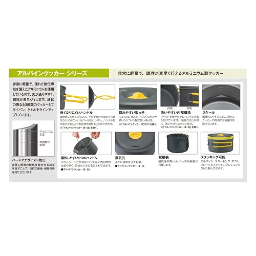 アルパインクッカーのシリーズの中で、最もベーシックな形状がいわゆる鍋型の「アルパインクッカー」です。広口タイプなので食材を入れやすく調理がしやすい設計になっています。14・16・18・20と、豊富な4サイズが販売されているのも特徴です。
