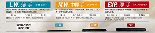 ミドルウエイト(M.W.)は中厚手と呼ばれるタイプで、日常から秋冬の低山登山、スノースポーツなど幅広く活用できるウェアです。エクスペディション(Exp.)は厚手タイプのインナーで、冬登山や極寒の環境におすすめです。