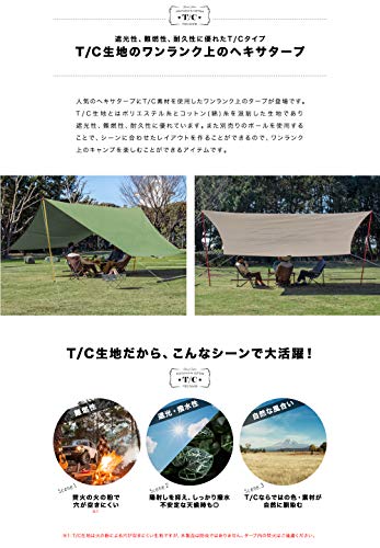 本品はフィールドアが発売するTC素材のヘキサタープ。ヘキサタープはタープのオーソドックスな形状をしており左右対称の六角形になっているため初心者でもきれいに貼れる魅力があります。また、フィールドアのタープはコスパが高く、TC素材特有の遮光性を持つ人気商品です。