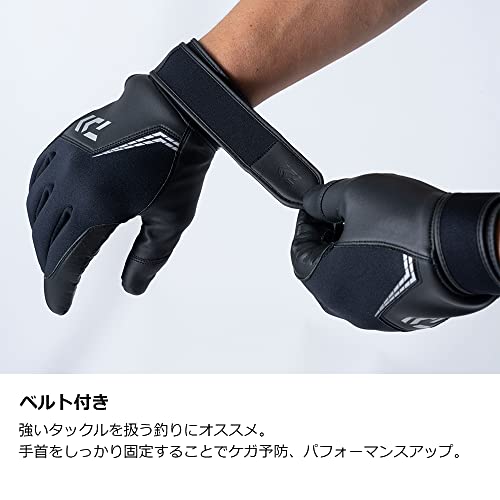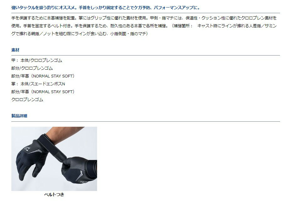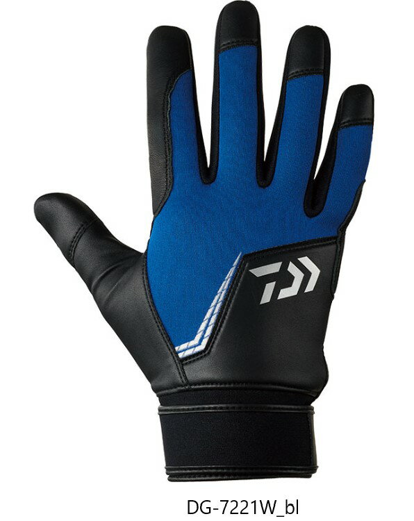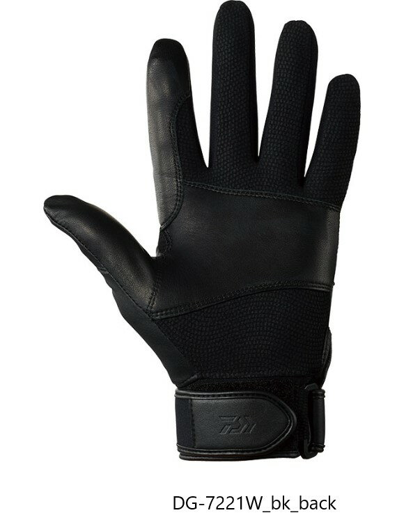 DG-7221Wは革とゴム素材の配置が工夫された、快適で安全なグローブです。手のひらにはエンボス加工を施したスエード革を採用しているので、すべる心配をせずにロッド操作ができます。また、甲側には厚めのクロロプレン素材を配し、保温性や防水性も万全です。