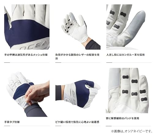 人差し指には頑丈さと感度を備えたカンガルー革を採用し、繊細な釣りが可能です。他の指はレザーで補強し、特に負荷が大きい親指部分のレザーの面積を増やすことで耐久性を上げています。