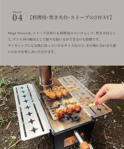 マジックストーブは連結式の煙突がセットになったストーブで、市販の薪をそのまま入れられるサイズがあります。ストーブの天板は2種類あり、調理と湯沸かしといったシーンに応じて使い分けるスタイルです。おしゃれなデザインが施されたガラス面は大きめの設計なので、キャンプならではの焚き火の雰囲気を満喫できるでしょう。