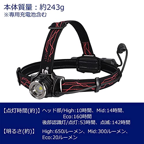 こちらもUSB充電ができるヘッドライトで明るさは約250ルーメン程度。バッテリー残量表示と赤色点灯機能があります。自重も約72gと十分に軽量です。