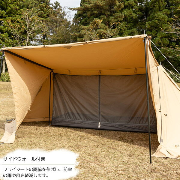 本品にはテント本体、インナーともにメッシュ窓があるため通気性の高いモデルです。他社のパップテントには窓はありません。また、入り口を跳ね上げた時に左右からの視線や雨風を防ぐサイドウォールもあり梅雨時でも使いやすい構造です。