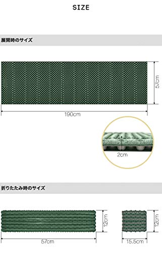 サイズは190cm×57cm×厚み2cmのモデルのため用途としてはキャンプや登山に向いているでしょう。また、薄いため冬キャンプには向いていないモデルと言えます。