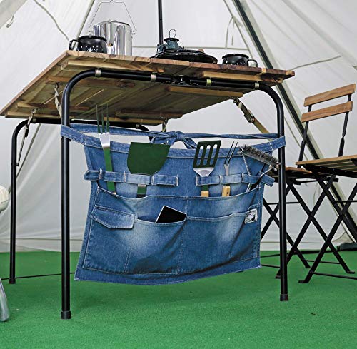 本品の腰紐はバックルやマジックテープなどで固定するわけではありません。そのため腰に着けるたびに紐を括る必要があります。その反面、脚から脚の間隔が短いテーブルに直接くくりつけることでテーブルの小物入れとしても活用できます。ヘラやコテなどの調理器具を入れておくなどアイデア次第でさまざまな使い方が可能なエプロンです。