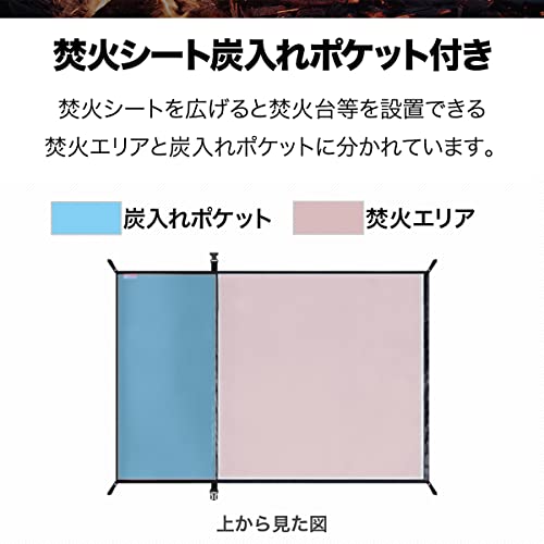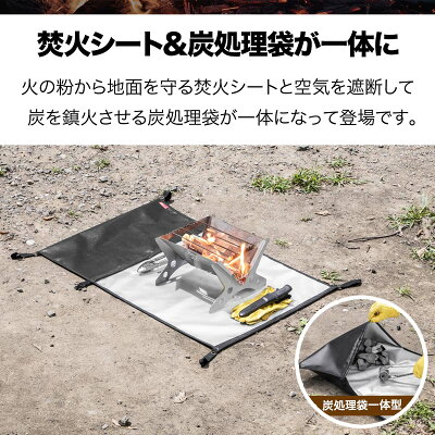 本品はコスパ、使い勝手共に最強クラスの焚き火シートです。本品は炭を鎮火させるためのスペースがあり、ほぼ鎮火した炭を袋部分に入れて完全に鎮火させられるようになっています。きちんと口を閉じ折りたたむことで灰をこぼさず持ち歩けます。