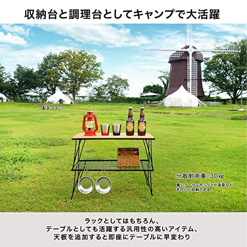 兼用になるフィールドラックはテントサイトで、並べる、重ねるなど多用途に使えて便利です。食材や調味料、鍋などを置いたり、天板を付けてテーブルとしても使います。