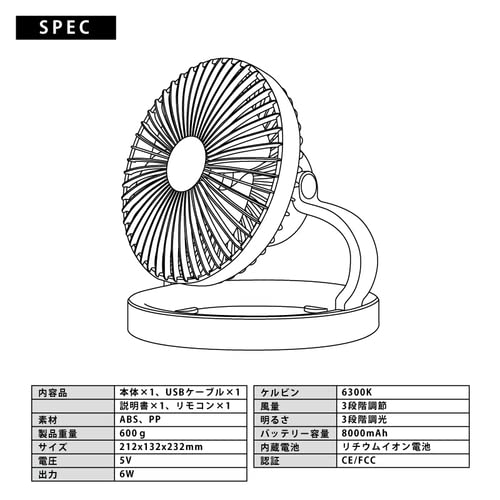 こちらのファンには8000mAhの大容量バッテリーが搭載されていて、扇風機単体で使用した場合「弱」設定なら20時間と1日近く使用できる計算です。また、バッテリーからUSBケーブルにて他の電子機器への給電もできるので災害などへの備品としても活用できます。