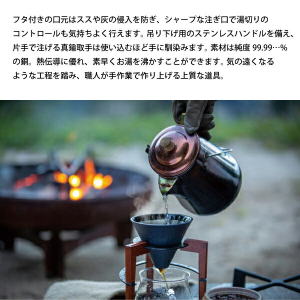 焚き火関連のギアを扱うファイヤーサイドの商品で満水容量1.8L、適正容量は1.0Lです。3万円前後の高級品でベテランキャンパーからも支持を得ています。高純度の銅素材は熱伝導率が高く、湯沸かしの時間を短縮できるでしょう。