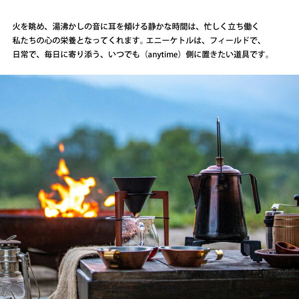 エニーケトルは本体と注ぎ口の接続にリベット加工を施すなどデザインも洗練されています。また、銅素材は使うほどに深い味わいが出てくるのも魅力です。底の直径(138mm)はカセットコンロにも対応し自宅でも気軽に活用できます。